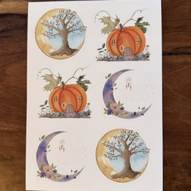Planche format A5, de 6 stickers : 2 « citrouille », 2 « lune », 2 « l’arbre et la lune ».